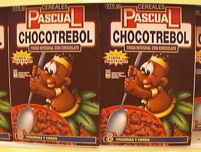 Now, here's a cereal that's just going to get people mad. Sure, he's a cute little cartoon character, but this is just plain wrong. Funny, but wrong. (Hey, don't email me to say that you're mad that I find this funny. I didn't invent the Chocotrebol mascot. And I think the "wrongness" is half of the funny part.) | Another totally wrong mascot. Jar of chocolatey drink mix, like Quik or Horlicks. Decorated with kerchiefed slaves carting bags of cocoa on their heads. But then, maybe Cola Cao is actually made that way. Heck, maybe Quik and Horlicks are made that way and Americans and Brits just choose to ignore it. Having this mascot for your drink mix is like having a cute T-shirt featuring a big photo of the child laborer who sewed it for you. |