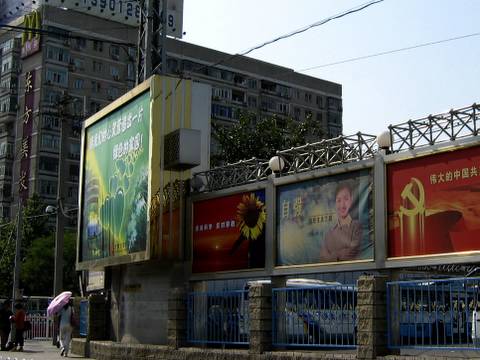 This is in downtown Beijing, China. I think it's ironic that you can see a poster for the Communist party and a sign for McDonalds at the same time. That's progress for you, I suppose. (There's a small golden arches in the upper left of the left photo. I don't know if you saw it or not. It's easy to miss.) |