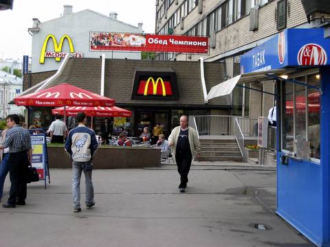 McDonalds in Rajasthan, India. My favorite is the Paneer Salsa Wrap, but the McAloo Tikki is pretty good too. | The famous "first McDonalds" of Moscow. People in Moscow are fairly famous for not being so friendly. The staff at McDonalds is the exception. They were the only Muscovites I saw smiling. |
